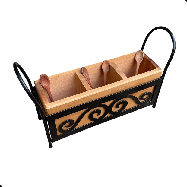 Para deixar seus talheres organizadas de maneira prática e simples, a Porta Talher é o produto ideal, garantem a comodidade de organizar o conjunto e trazer mais beleza a decoração do ambiente da sua cozinha. Fabricado em ferro com pintura eletrostática (Não enferruja) e madeira jequitibá, podemos garantir que este produto ira durar muitos anos sem perder seu charme.
