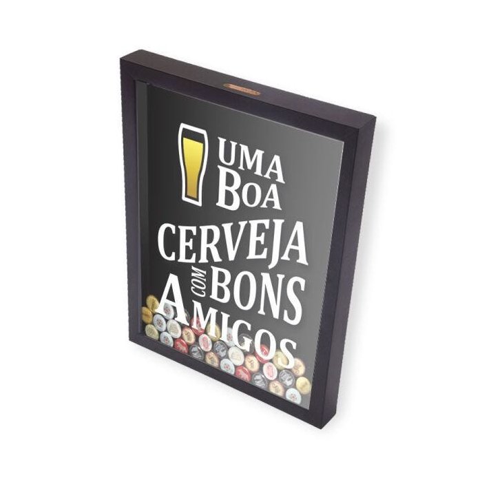 QUADRO PORTA TAMPINHAS CERVEJA - MODELO 21 FRASE: UMA BOA CERVEJA COM BONS AMIGOS Lindo quadro porta tampinhas, ideal para decorar de forma divertida e colecionar as boas cervejas apreciadas. Produzido em moldura proveniente de reflorestamento com 3cm de largura! Foi projetado exclusivamente para que os rótulos das tampas fiquem aparecendo. Dimensão 33x45x7cm (LxAxP) e 3 opções de cor de molduras. Acompanha suporte de fixação e batente de silicone para não danificar sua parede. A frase é aplicada sobre o Vidro Frontal. Fundo removível para limpeza. Prazo de produção :5 dias úteis após a confirmação do pagamento do pedido.