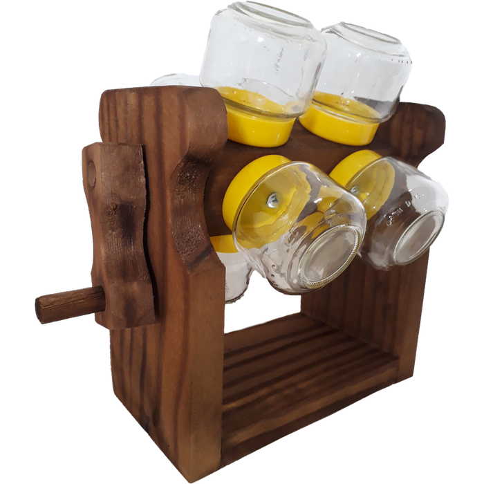 Porta Tempero Giratório com Manivela e 8 Potes de Vidro - Tampas Pretas