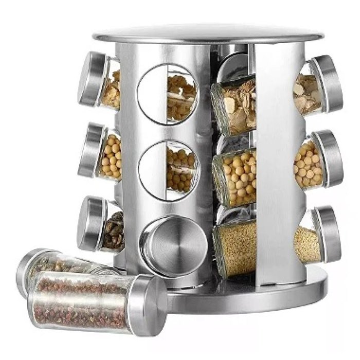 Porta temperos giratório em aço inoxidável, uma solução prática, moderna e elegante para organizar e armazenar temperos na cozinha. Com um design rotativo e compacto, esse organizador de temperos é perfeito para facilitar o acesso rápido e eficiente aos seus condimentos favoritos, ao mesmo tempo em que mantém a bancada organizada e sofisticada.