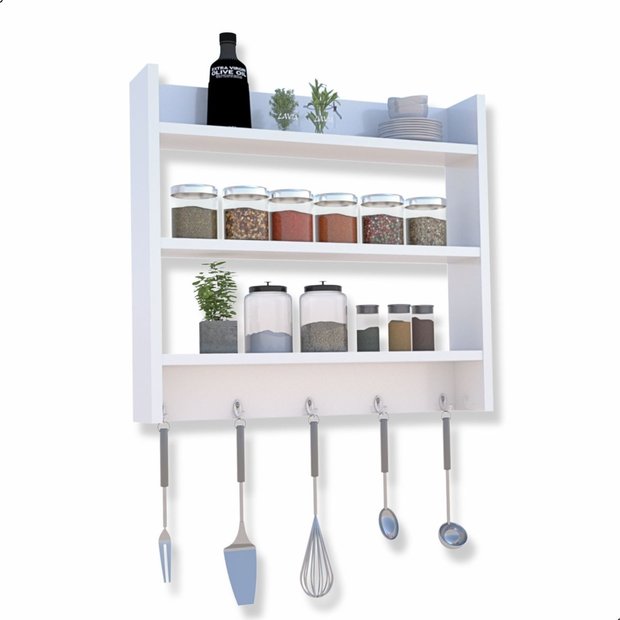 Com 3 prateleiras muito espaçosas e 5 ganchos de metal, nosso porta tempero oferece o espaço e a praticidade que você deseja.