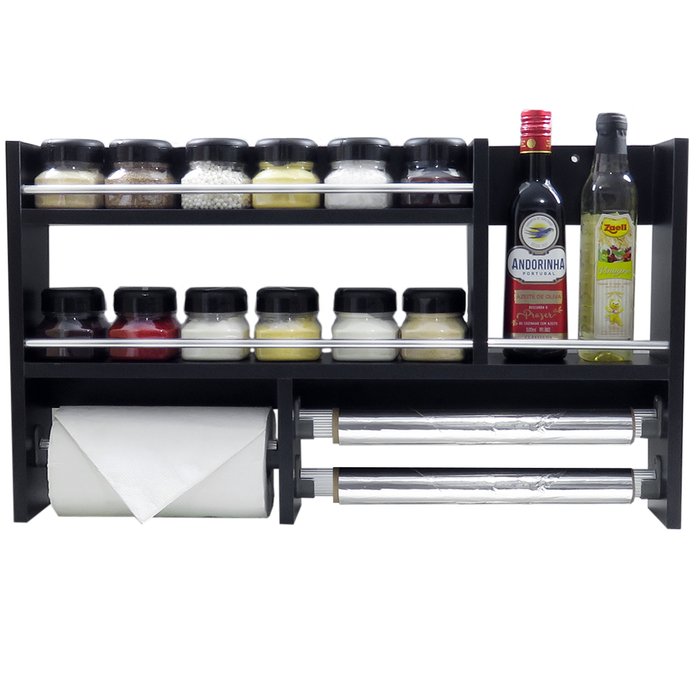 O Porta Tempero da Arrigo Móveis é ideal para guardar vidros de azeite, vinagre, pimentas e demais condimentos da cozinha. Além disso, o rolo de papel toalha deixa sua cozinha muito mais bonita, organizada e prática.- Marca: Arrigo Móveis- Modelo: ARMO91Características:- Cor: Preto- Peso: 3,700kg- Altura: 39cm- Possui 2 Prateleiras - Comprimento: 68cm- Material: MDF 15mm- Profundidade: 10,5- Largura útil da prateleira menor: 9cm- Comprimento útil das prateleiras: 45,5cm- Largura útil das prateleiras maiores: 7cm- Comprimento útil da prateleira menor: 19cm- Distancia entre as duas prateleiras maiores: 13,5- Possui 3 suportes em alumínio 2 de 36,5cm e outro de 25cmObservações: Possuímos esse produto nas seguintes colorações;- MDF 15mm Branco- MDF 15mm PretoImportante:- Acompanha parafuso e buchas para fixação.- Não acompanha objetos decorativos e temperos. O produto já vai montado e pronto para fixação no local desejado.- Montagem, desmontagem e outras instalações do produto são de responsabilidade do comprador.- Não deixar exposto diretamente ao sol e umidades excessivas.- Pode haver alguma diferença de tonalidade entre a imagem e o produto real, por conta do tratamento de imagens e a calibração de cores do seu monitor.- Ao receber a mercadoria, o recebedor deverá verificar as condições da embalagem, e caso haja alguma avaria que tenha afetado o produto, não assine o comprovante do transportador.Itens Inclusos- Porta Tempero em MDF 15mmGarantia6 meses de garantia contra defeito de fabricação.* Foto do Produto Meramente ilustrativa, peças de decoração não acompanham os produtos, exceto se informado no anúncio.* Todas as informações divulgadas são de responsabilidade do fabricante/fornecedor.