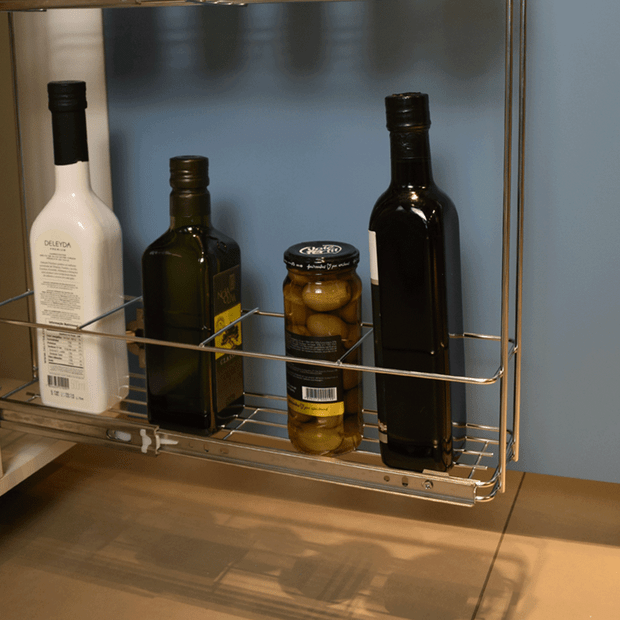O porta temperos deslizante é ideal para instalação no interior do móvel. O design diferenciado desse porta latas e condimentos foi elaborado com corrediças laterais que agregam em funcionalidade, proporcionando o fácil acesso ao conteúdo armazenado. A gaveta porta temperos, óleo, vinagre e latas possui divisórias para acomodar pequenas garrafas de forma firme e segura. Garanta beleza e inovação em sua cozinha com esse suporte deslizante de condimentos.
