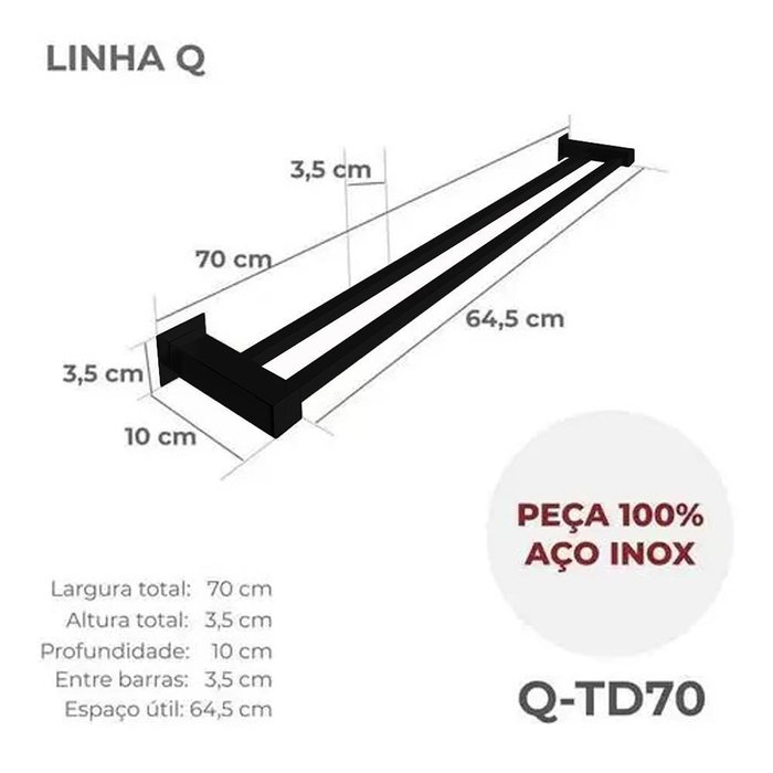 | Modelo | Porta toalha duplo banheiro 70cm aço inox 304 preto fosco |