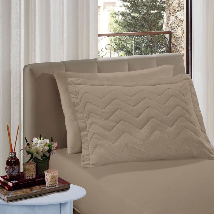 Este produto de cor Creme de Avelã é um charme para sua cama! Com seu tom liso é perfeito para manter o padrão do quarto. Fabricado em malha 100% algodão com fio penteado 30/1 e gramatura de 120g/m². Nosso Porta Travesseiro contém um leve acolchoado em 100% Poliéster e gramatura de 60g/m², perfeito para dar o toque de acabamento a cama e protegê-la. Por ser mais leve, é ótimo para o dia a dia, tanto para dormir, quanto para embelezar a cama. O toque natural do algodão contribui para um tecido mais suave e prático. Acabamento com 3 abas e bordado zig-zag que faz com que o enchimento permaneça no lugar por mais tempo.