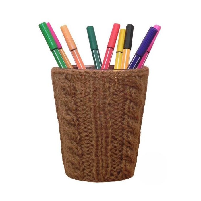 Tem porta-treco mais lindo do que esse? Feito em tricô a mão, revestindo um recipiente acrílico, ele é super detalhado e delicado, com tranças e listras. Serve para guardar um montão de coisas... No escritório ou na escrivaninha, guarda-se canetas, réguas, tesouras, e tudo quanto é tipo de materiais de papelaria. No quarto e na sala, podemos guardar todo o tipo de coisa e também podemos usá-lo como cachepô, fazendo com o arranjo, um enfeite incrível. E no banheiro é perfeito como suporte para escovas de cabelo, pincéis de maquiagem, a própria maquiagem, e tudo aquilo que precisar! - Cor: Chocolate; - Material: Acrílico e lã; - Dimensões (AxLxP): 11x9x9cm; - Prazo para despacho: 3 dias úteis;