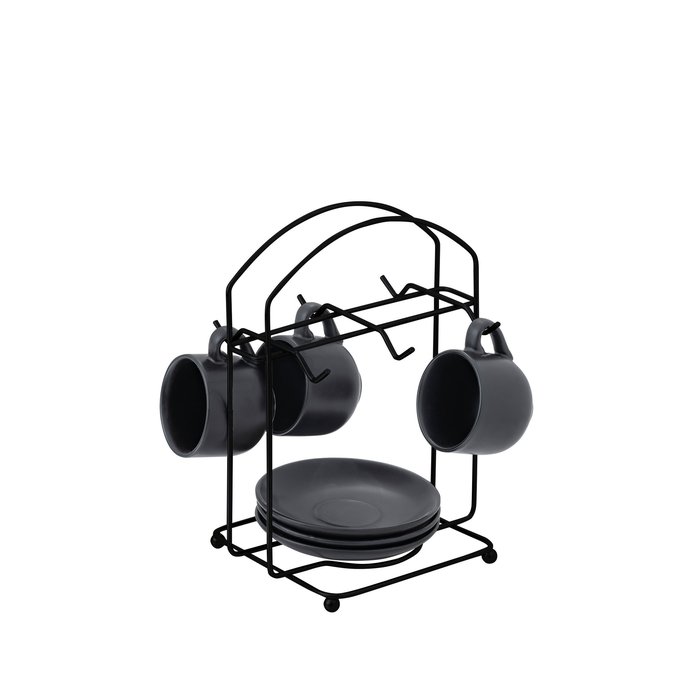 Suporte para xícaras produzido em aço epoxy preto, material conhecido por sua durabilidade e resistência. A peça possui capacidade para dispor até 06 xícaras e pires em sua parte inferior, sendo perfeita para secar e guardar cada item com muita praticidade. Para manter sua cozinha sempre limpa e em ordem são necessários objetos que auxiliam em seu dia a dia, de maneira funcional. Observação: os demais itens na imagem são ilustrativos e não acompanham o produto.