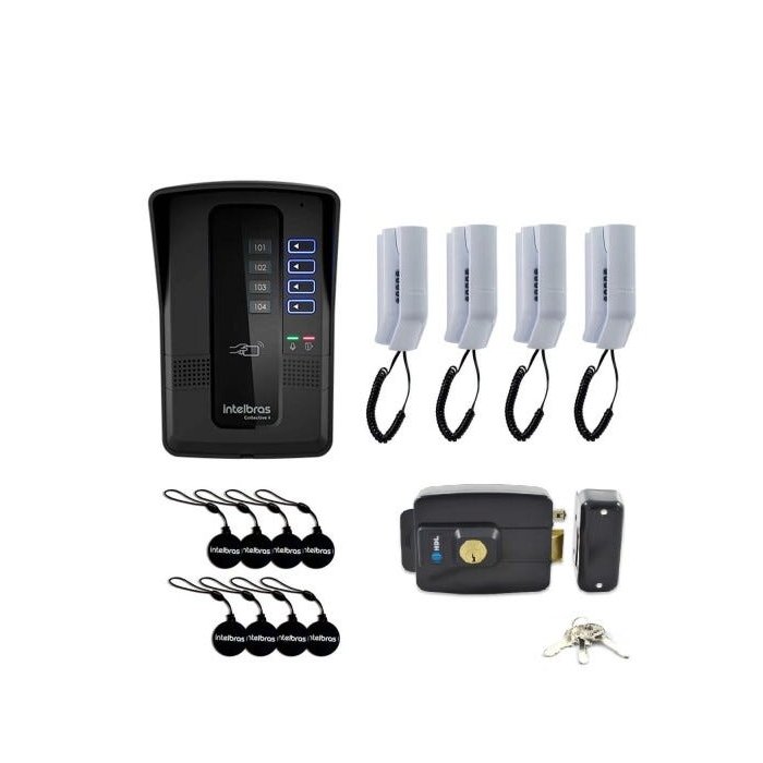 Perfeito para condomínios de pequeno e médio porte, o Kit Porteiro Coletivo de 4 Pontos reune um sistema de central de portaria, com porteiro eletrônico, ramais internos, controles de acesso via cartão de proximidade e fechadura elétrica.
