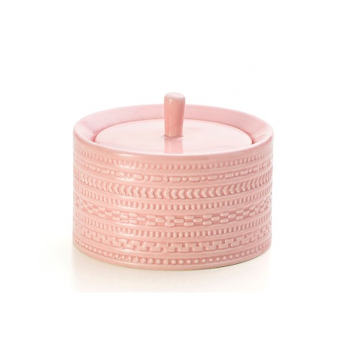 Pote produzido em cerâmica com pintura na cor rosa claro, os detalhes nas laterais lembram mandalas, o que deixa a peça ainda mais linda. A tampa também é de cerâmica rosa claro.