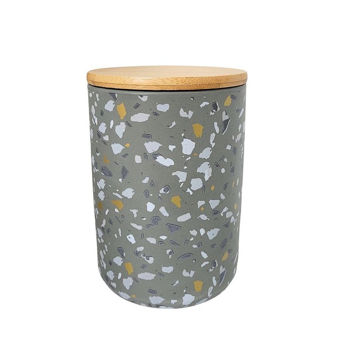 -01 unidade Pote Porcelana Decorado Confete Granulado Cinza c/ Tampa Bambu 13cm