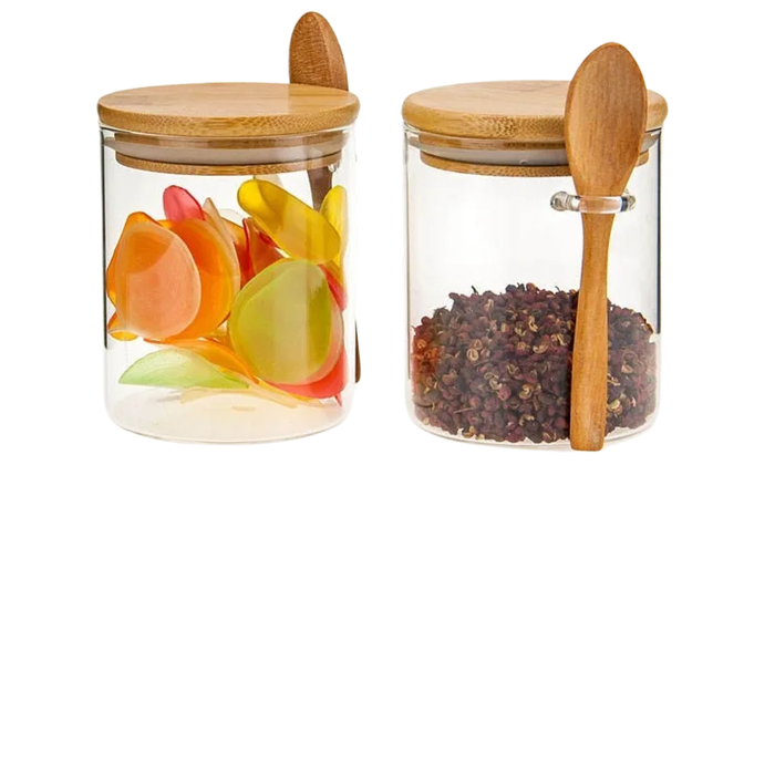 Pote em Vidro Redondo com Tampa Hermética e Colher de Bambu