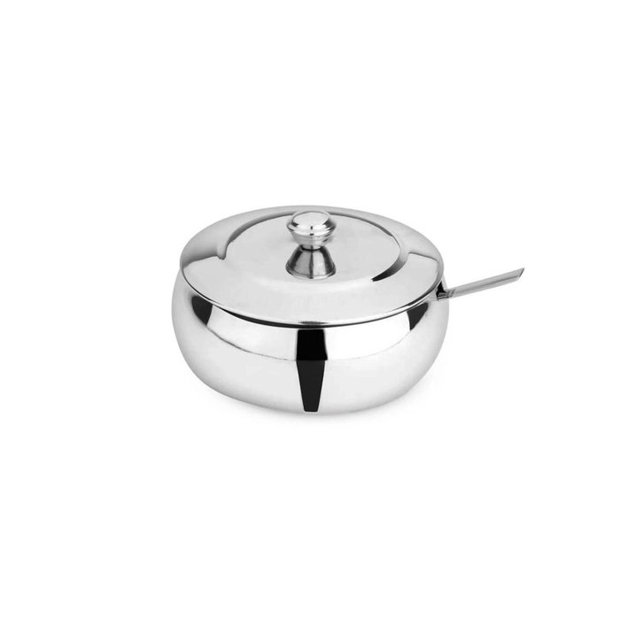 Farinheira em aço inox com colher. O porta farinha é perfeito para qualquer ambiente. Produzido em aço inoxidavel, nao solta nenhum residuo nos alimentos e é altamente duravel. Possui acabamento em brilho e é proprio para uso diario. O farinheiro é versatil e atemporal, ideal para servir farinhas, graos e farofa. Pode ser lavado, diariamente, na maquina de lavar louças.