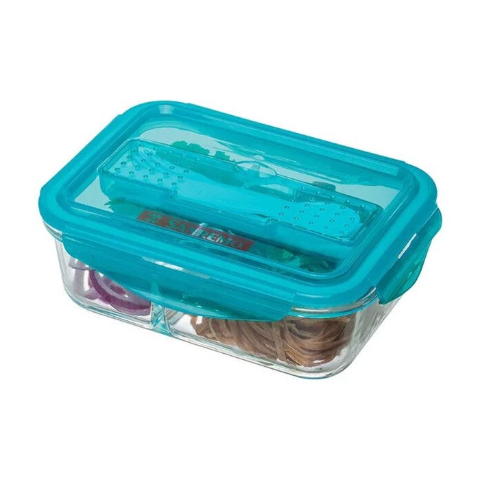 Pote de vidro retangular com 1 litro, divisória, talheres, tampa colorida e travas herméticas, produzido em vidro borosilicato, fechamento hermético através de anel de vedação em silicone, utilizado para acondicionar, transportar e servir alimentos diversos.