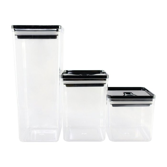 Seu design conta com 3 tamanhos e capacidades diferentes, os organizadores são perfeitos para todas as suas necessidades, podendo guardar diversos tipos de alimentos com facilidade, possuindo uma abertura com alavanca, além da vedação hermética e possibilidade de empilha-los.