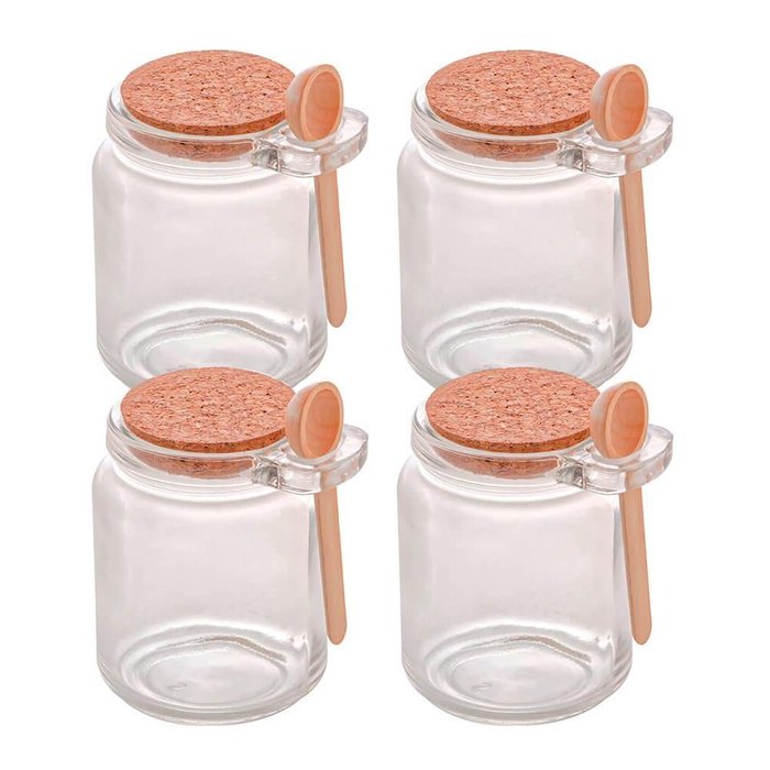 Os potes de vidro porta tempero da Lyor, é feito de vidro com tampa de rolha e colher de bambu, possui aproximadamente 9,5cm de altura e 7cm de diâmetro, a colherzinha possui 8,5cm de comprimento. Este pote possui uma infinidade de utilidades, é perfeito para armazenar todos os tipos de temperos, para preparar doces de pote, chocolates, lembrancinhas e o que mais sua imaginação permitir.