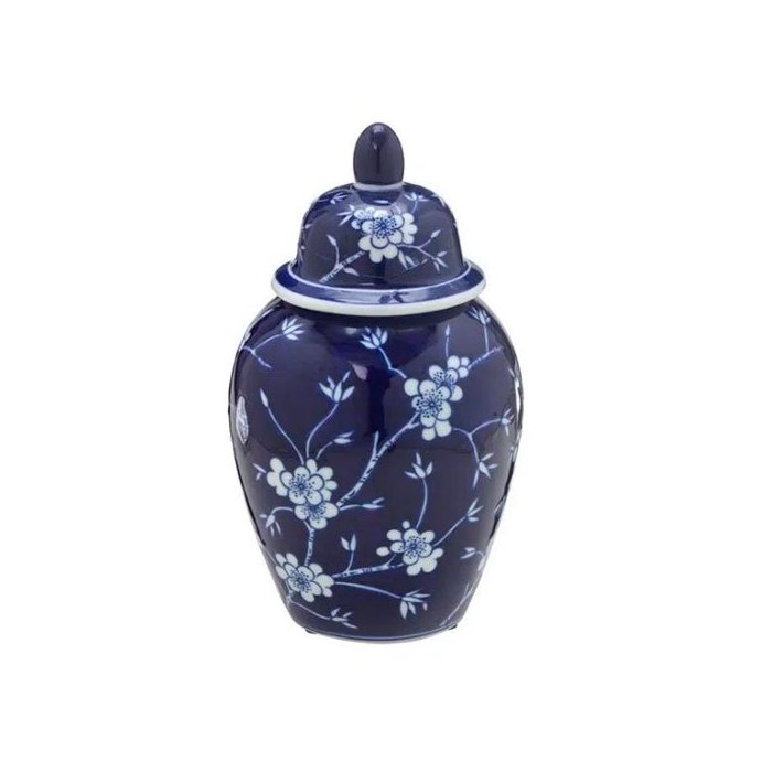 Potiche Decorativa Porcelana para Mesa de Centro Hall de Entrada Azul Escuro Florido - 26,50x15,50cm