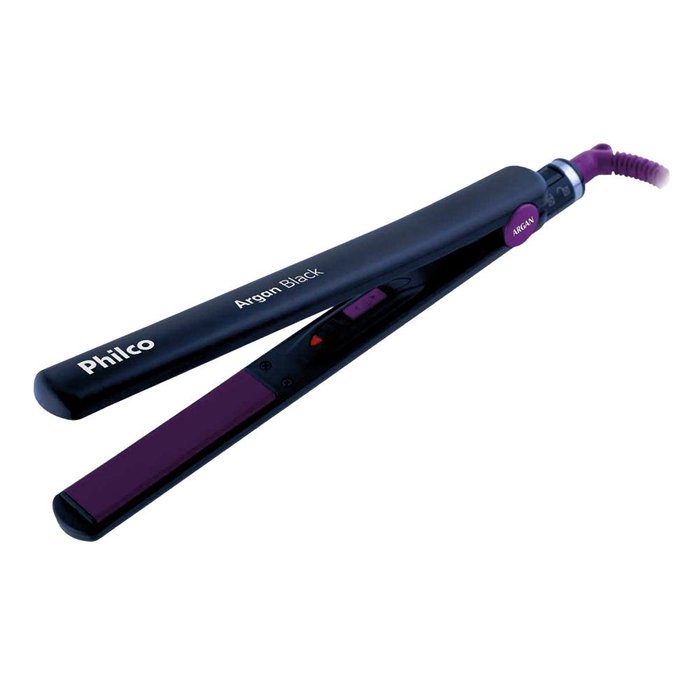 Informações do Produto Placas de cerÂmica com tratamento em Argan Prancha com trava de fechamento 2 em 1 - alisa e cacheia Cabo emborrachado Cordão giratório 360° Cordão de 1,8 metros Anel para pendurar Luz indicadora de funcionamento Botão liga/desliga Temperatura de 230°C Produto bivolt Composição: Metal e Plástico