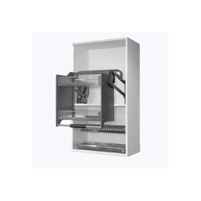 Prateleira Basculante com sistema de travamento para uso em móveis aéreos. Estrutura em aço, componentes metálicos nas articulações, bandejas compostas de metal com laterais em vidro e tapete emborrachado nas bandejas com acabamento cinza.