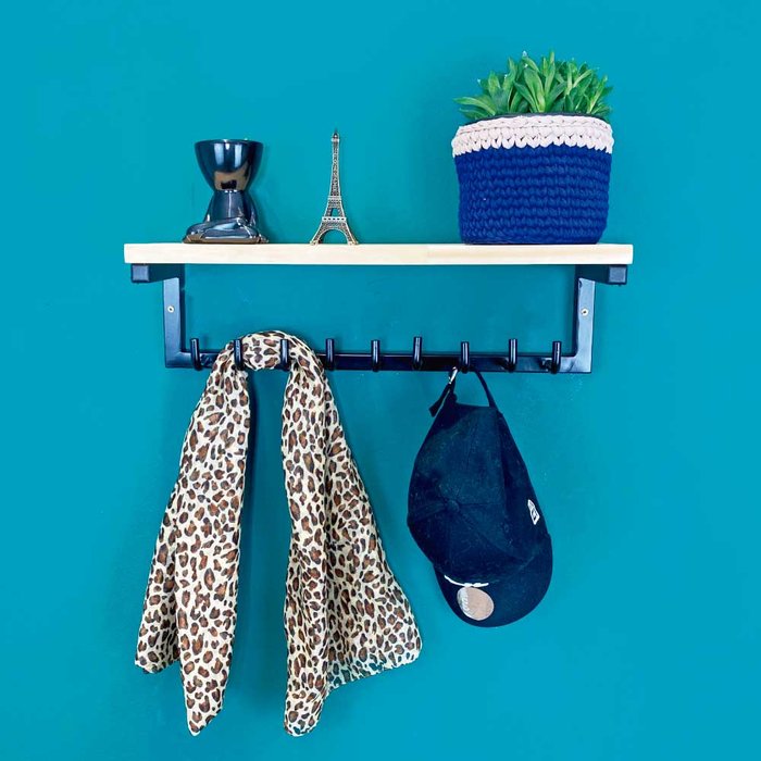 A Prateleira com Cabideiro Style é uma ótima pedida para organizar! Nossa prateleira com cabideiro é uma ótima maneira de organizar decorando. Ele conta com uma prateleira super espaçosa e um cabideiro com nove ganchos onde você pode pendurar casacos, mochilas, bolsas, o que você precisar. Ele fica ótimo no hall de entrada, junto com uma sapateira, no quarto para você organizar suas coisas, onde sua imaginação permitir. A nova linha Style possui o ferro mais grosso, deixando com uma cara ainda mais industrial. E a gente adora <3 Sobre o Produto: •Tamanho do Móvel: 14,8cm (a) x 50cm (c) x 14,5cm (p); •O cabideiro possui 9 ganchos de 7,6cm •Produzido com ferro com tratamento antiferrugem; •Pintura a pó eletroestática; •Prateleira em madeira maciça Pinus; •É necessário o uso de uma furadeira para furar a parede; •É necessário o uso de chave Philips para prender a prateleira na parede; •Enviamos parafusos. •A prateleira com cabideiro vai MONTADO