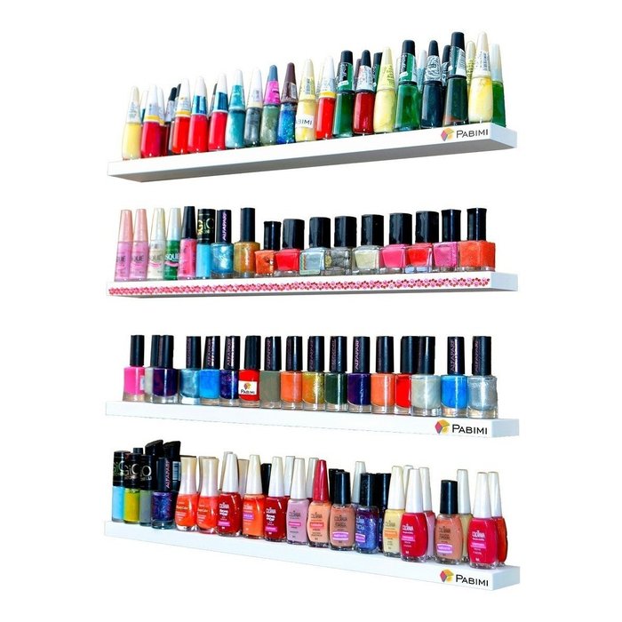 Kit com 4 Prateleiras de alta qualidade para esmaltes, maquiagem ou pequenos objetos. ideal para paredes de drywall ou alvenaria. Este novo modelo não possui aba na frente e nem atrás facilitando, porém é ideal para abrigar seus esmaltes de maneira prática e bela