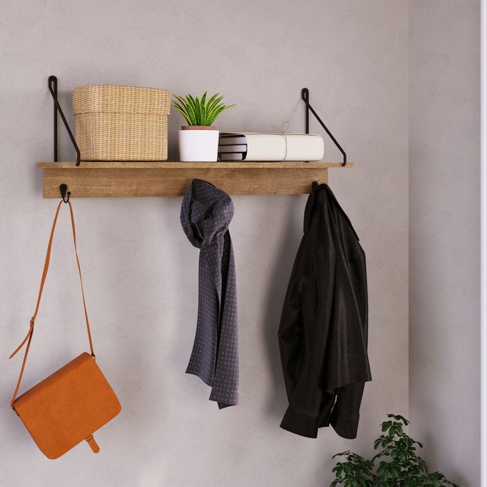 A prateleira possui medidas de 90 cm de largura, 23 cm de profundidade e 34,20 cm de altura, sendo ideal para espaços variados. Além disso, conta com três ganchos metálicos com acabamento em pintura fosca, perfeitos para pendurar bolsas, casacos, lenços ou qualquer outro item que sua criatividade permitir.