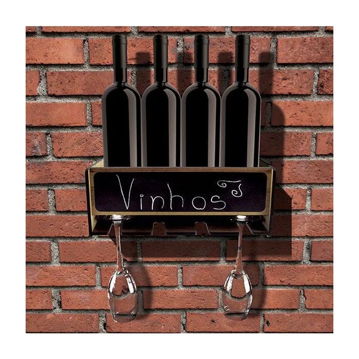 Prateleira para Garrafa e 4 Taças com lousa MDF cru e preto