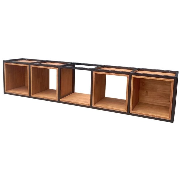 Este modelo de prateleira suspensa é um dos elementos mais versáteis e funcionais para compor um ambiente moderno e sofisticado. O modelo que apresentamos é formado por uma estrutura de ferro metalon em preto, dividida em cinco partes iguais. Dentro dessas divisões, encontramos dois nichos de madeira com fundos, dois nichos de madeira sem fundo e uma prateleira de madeira. A madeira utilizada é o pinus finger na tonalidade castanheira, proporcionando um contraste harmonioso com a estrutura metálica.