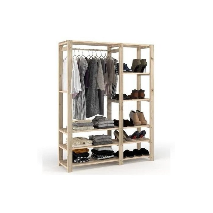 Estante arara com prateleiras e estrutura em madeira maciça de Pinus.