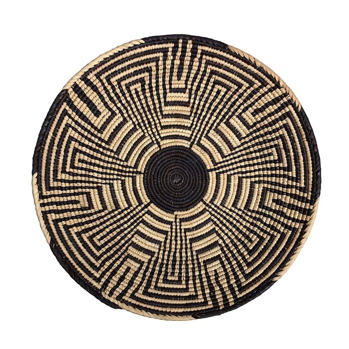 Prato de parede decorativo produzido em palha de fibra natural trançada com desenho geométrico na cor cinza.