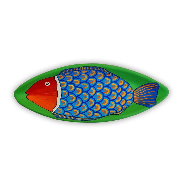 Produzido em cerâmica por uma artesã de Alagoas, este lindo prato decorativo tem cores vibrantes e gravura de peixe.