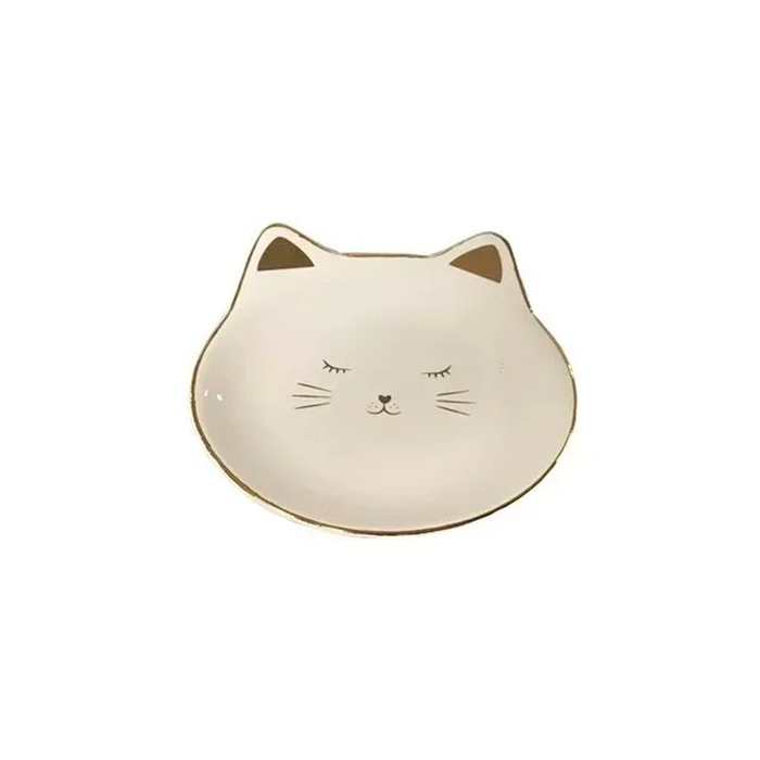 Prato Gato Ceramica Branco Com Dourado Porta Joias 10x10cm