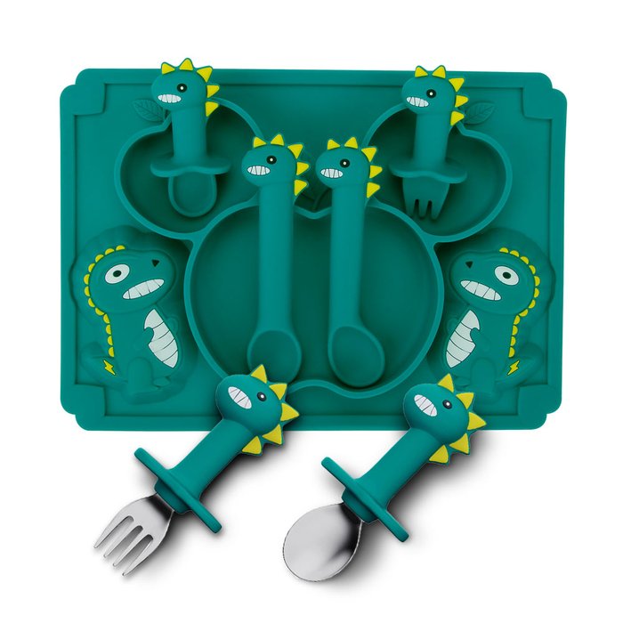 Prato Silicone bebê ventosa placa babadores alimentação conjunto talheres crianças colher de aço ino