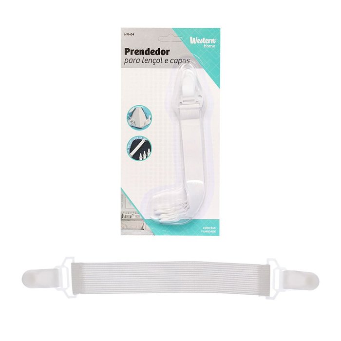 PRENDEDOR PARA LENÇOL E CAPAS - Dimensões da Peça: 23 x 2,5 x 0,6cm - Dimensões da Embalagem: 13 x 3,5 x 27cm- - Dimensões Inner: 34,5 x 31,5 x 14cm - Dimensões Master: 36,5 x 33,5 x 43cm - Material: Poliéster, Látex, PP e PVC - Cor: Branco- Tipo de Embalagem: Blister - Marca: Western Home - Origem: China- Indicações:
