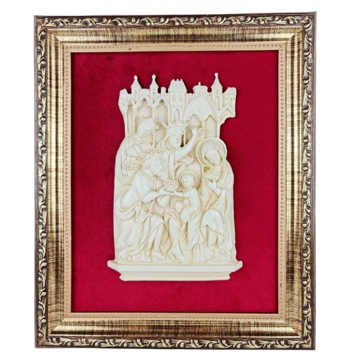 Quadro com figura em Alto Relevo da Cena da visita dos 3 Reis Magos ao Menino Jesus no Presépio de Belém