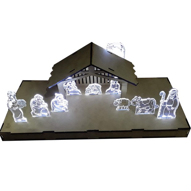 Presépio Led com Controle Remoto (16 cores) Já pensou em colocar esse lindo presépio na deoração de natal? A Led´s Marchi traz pra você presépio em ACRÍLICO e MDF com LED e Controle Remoto.Use a imageinação e incremente ainda mais sua decoração de natal com esse lindo produto. Partes do Presépio: Base em MDF com Celeiro 9 personagens + Estrela guia, todos com iluminação em LED Descrição dos personagens: 1 Menino Jesus, 1 Maria, 1 José, 3 Reis Magos, 1 Vaca, 1 Ovelha, 1 Pastor e 1 Estrela Guia. FUNCÕES DO CONTROLE. Aumento e diminuição de brilho. Ligar e desligar. Mudanças de cor para : Vermelho, verde, azul, branco e mais 12 tonalidades. Efeitos: Mudança aleatória, troca rápida e velocidade média. STROBE : Acende e apaga a cor Branca, troca lenta e gradativa. FADE : Troca automática de cor, lenta e gradativa. SMOOTH : Mudança aleatória de cor Acompanha Fonte para ligar na energia elétrica (bivolt) Acompanha controle remoto