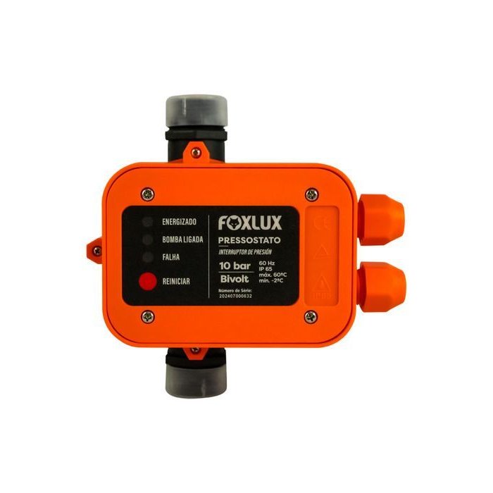 O Pressostato Controlador Automático Por Pressão da Foxlux, é o componente ideal para o controle de acionamento automático de Bomba D'água. Sua principal função é ligar e desligar a bomba de acordo com a demanda de pressão no encanamento. Com ele, você mantém a pressão da rede hidráulica, garantindo fluxo constante e estável de água. Possui 6 meses de garantia. Diferenciais Acionamento Automático Sistema de proteção contra funcionamento a seco Indicador em Led que sinaliza o funcionamento da bomba ou falhas Ficha Técnica Potência do motor: 55w (127v) e 1100w(220v)