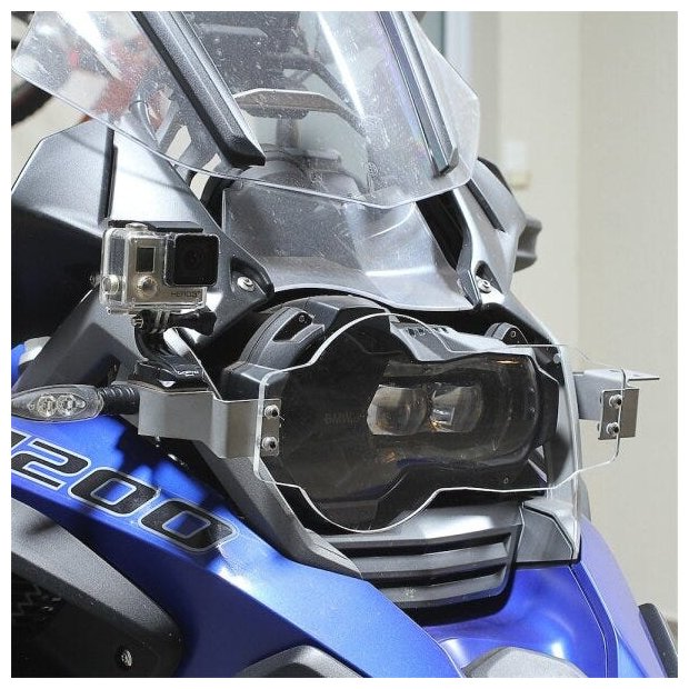 Protetor de farol BMW GS 1200 em acrílico com suporte em Inox para filmadoras de aventura que usam parafuso para fixar e protetor de linha com cerol.