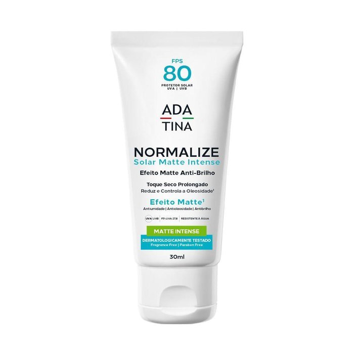 Protetor Solar FPS 80 Resistente A Água Normalize Matte Intense FPS 80 é um protetor solar que matifica intensamente com ação antioleosidade, anti-brilho, antiumidade e resistente à água, desenvolvido especialmente para a proteção e tratamento das peles mistas, oleosas e com brilho excessivo, além de ser altamente resistente ao sebo¹, mantendo a pele muito mais matificada, sequinha e livre de oleosidade o dia todo, tudo isso com 12 horas de proteção solar e 12 horas de fotoestabilidade. Efeito Matte 100% Menos Oleosidade Normalize Matte Intense FPS 80 é formulado com as exclusivas Microssílicas Matificantes -sílicas até 15 vezes menores do que as sílicas comuns – que reduz em 100% a oleosidade e o brilho excessivo da pele¹, matificando intensamente e conferindo toque seco prolongado e efeito matte intenso ao longo de todo o dia, ideal para ser utilizado antes da maquiagem por possuir efeito primer matificante. Toque Seco Não Pegajoso Normalize Matte Intense FPS 80 possui textura leve, extrasseca e não pegajosa, que é absorvida rapidamente pela pele com fácil aplicação e espalhabilidade, conferindo também uma incrível ação matificante, antioleosidade, antibrilho e antiumidade de longa duração, garantindo uma pele muito mais sequinha ao longo do dia. Tecnologia Solent® Tripla Proteção Solar 12 Horas UVA, UVB e Anti-UVA1 Longo A tecnologia Solent® , exclusiva de ADA TINA, assegura tripla proteção altamente duradoura para a pele. Com extrema eficácia de 12H de proteção UVA, UVB e Tinosorb® M Anti-UVA1 Longo, além de também contar com 12 horas de fotoestabilidade. Isso porque, sua combinação sinérgica de filtros solares intensamente fotoestáveis garantem máxima proteção para a pele sem que sejam necessárias tantas reaplicações ou retoques durante o dia, salvo em contato com água ou sudorese intensa. Além disso, os protetores solares ADA TINA são muito mais concentrados! *A aplicação de apenas 1 dedo, equivalente a 1g de produto, é suficiente para proteger todo o rosto e atingir o FPS declarado na embalagem do produto, ou seja, para conseguir a proteção exata e perfeita! * Informações de acordo com as normas europeias da COLIPA, reconhecida pela ANVISA.