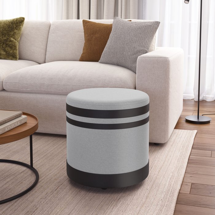 Puf Puff Banqueta Redondo Linho com Detalhes em Couro Preto
