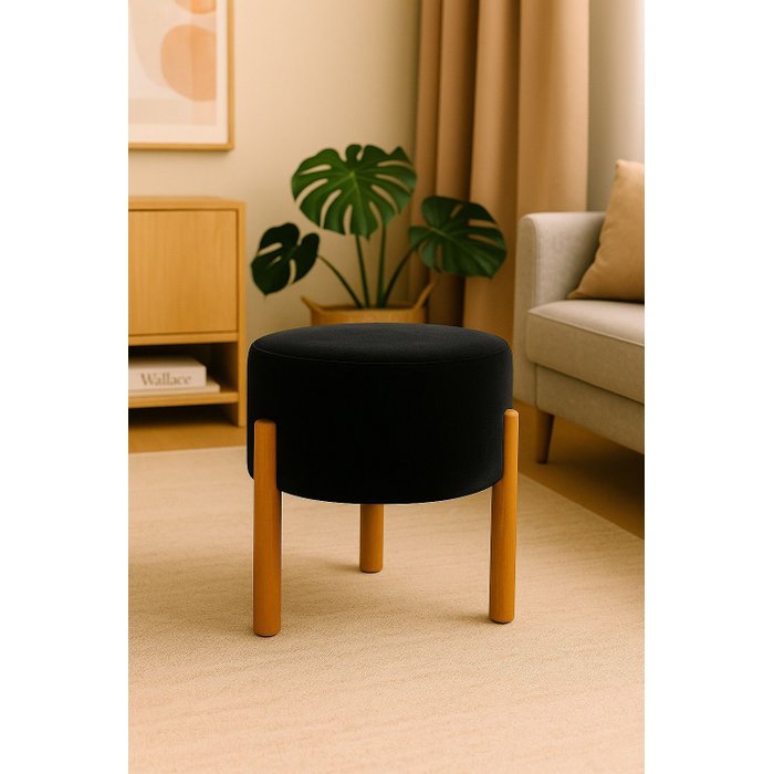 Puff Apolo Pes de Madeira Preto Veludo PRETO