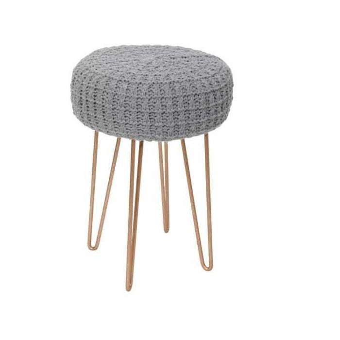 Puff Banqueta de Crochê Tricô Cinza Redondo com Base Metálica Dourada Rose Gold