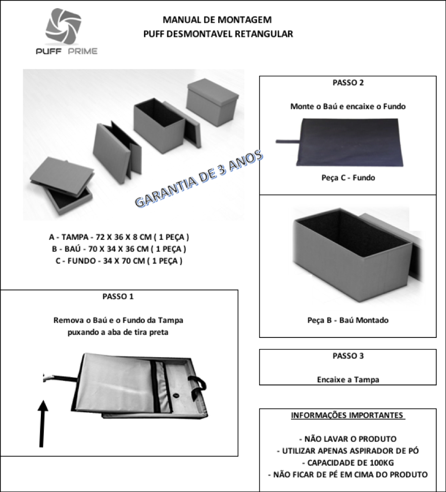 | Itens Inclusos | Puff , Manual de Montagem e Folder. |