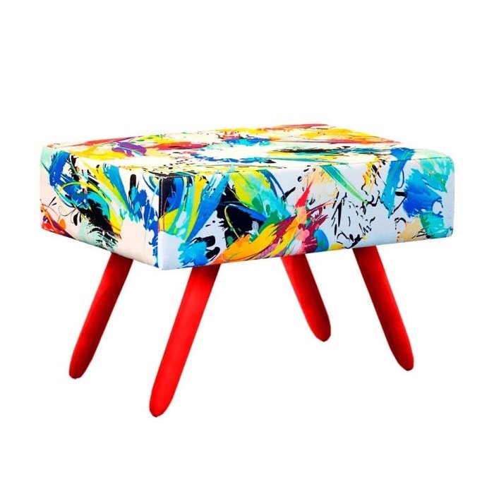 Puff Charme Estampado Color D18 Pés Palito Vermelho D'Rossi separamos essa estampa color no Puff Charme para você inovar em sua decoração. Produzido em madeira de eucalipto, seu estofamento D-26 e tecido decorativo impermeável com resistecia a água e os pés palito madeira vão dar aquele conforto que você procurava!