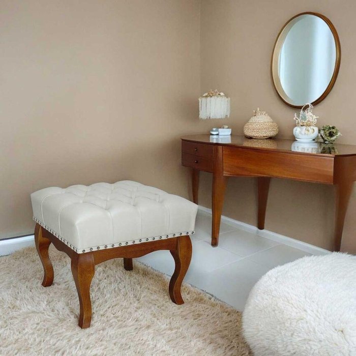 Puff Closet Multiuso Pequeno Madeira Maciça Imbuia e Branco Luna O Puff Closet Multiuso Pequeno Luna, tem curvas lindas e é feito de madeira maciça, trabalhado a mão, o seu estofamento em capitonê chama a atenção e se destaca. O seu acabamento feito com tachas da mais ênfase ao seu tecido facto na cor branco. Pode ser usado em salas ou quartos em sua penteadeira, por exemplo. INFORMAÇÕES TÉCNICAS: MATERIAL: Madeira maciça de caixeta, tecido facto e espuma D23.ACABAMENTO: Capitonê.ALTURA: 45 cm.LARGURA: 48 cm.PROFUNDIDADE: 48 cm.PESO: 7 Kg.COR DO TECIDO: Facto Branco.COR DA PINTURA: Verniz Imbuia.GARANTIA: 90 dias.MONTAGEM: Produto montado.A cor do produto real pode variar um pouco com a foto.