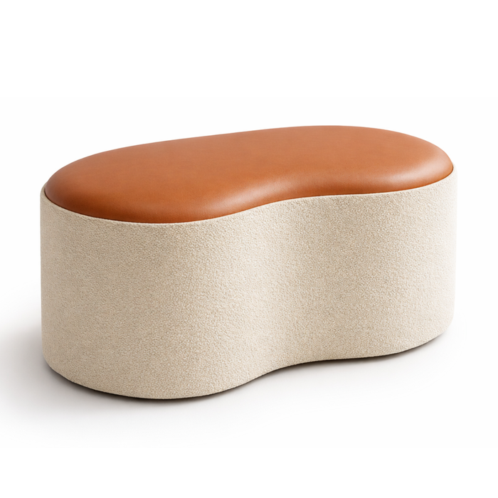 | Linha ou Coleção | Puff Decorativo Feijão Com Tampo de Corino Caramelo e entorno em Bouclé |