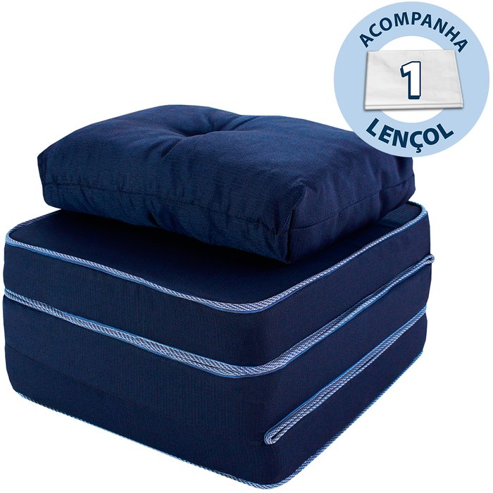 Puff Multiuso com Lençol e Travesseiro Solteiro 3 em 1 em Tecido Azul BF Colchões