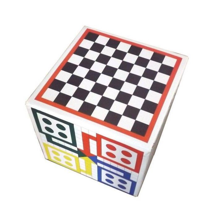 Um puff quadrado com 5 jogos, cada lado possui jogo diferente, sendo eles: Ludo, Resta Um, Dama, Xadrez e Jogo da Velha. Acompanha 52 peças em EVA e 01 dado espumado revestido em bagum.