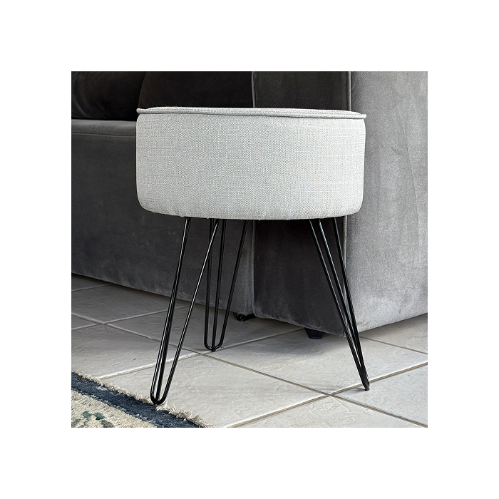 Banqueta Puff Redondo Carrera – Pé Aramado Preto | Assento em Linho Cinza