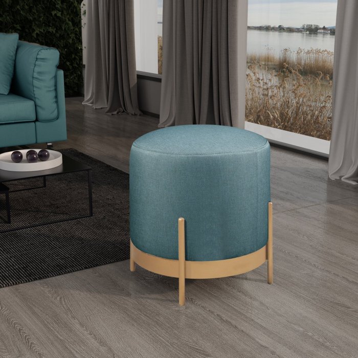 Puff Redondo com Base de Ferro Dourada e Estofado Ágar Azul