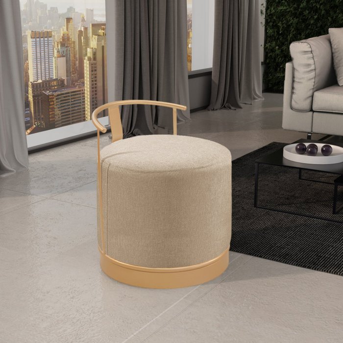 Puff Redondo com Base em Ferro Dourada e Estofado ÁQuila Bege/Dourado